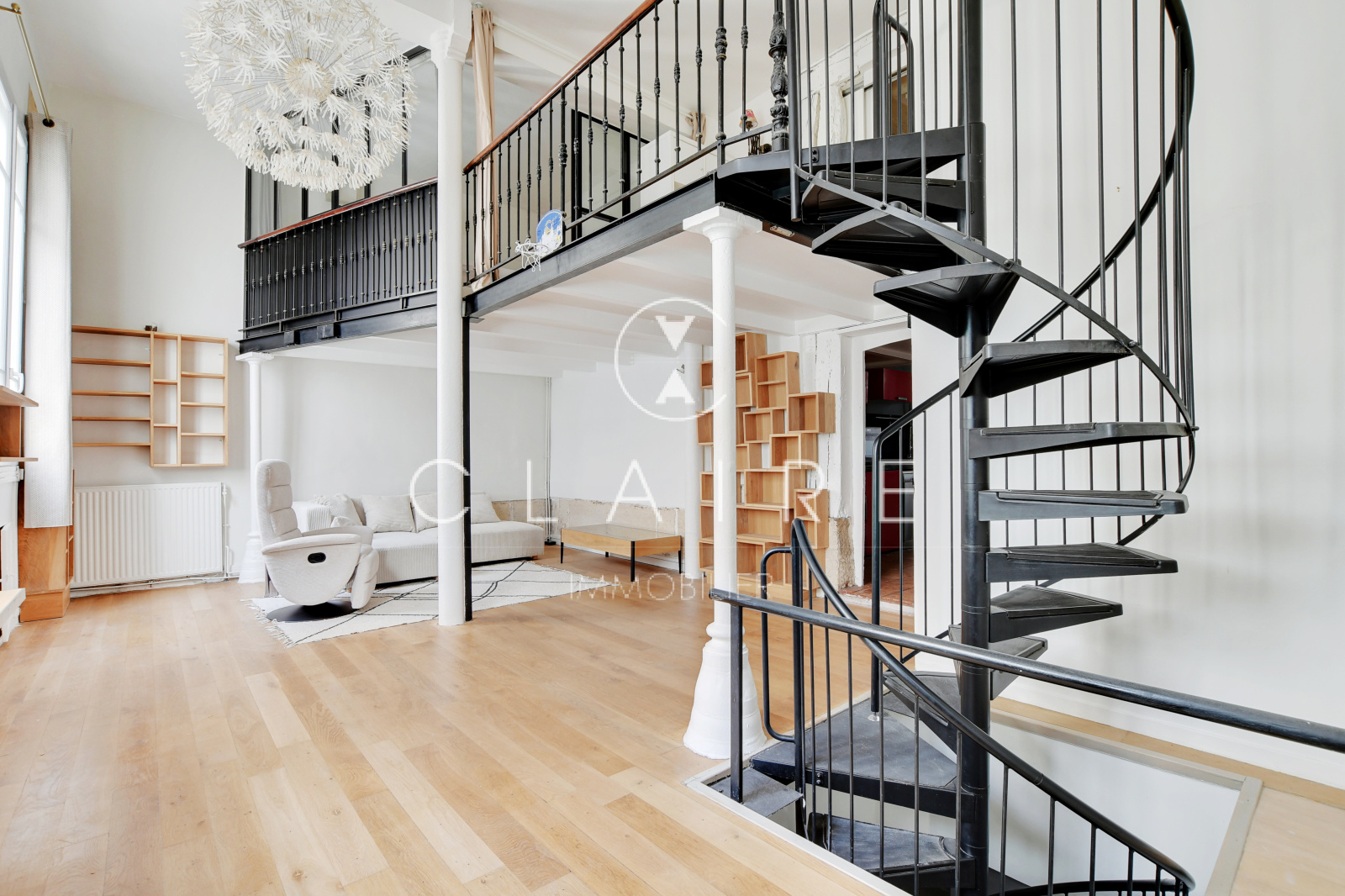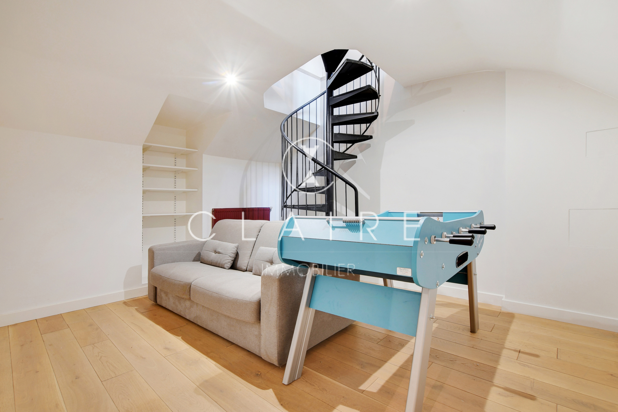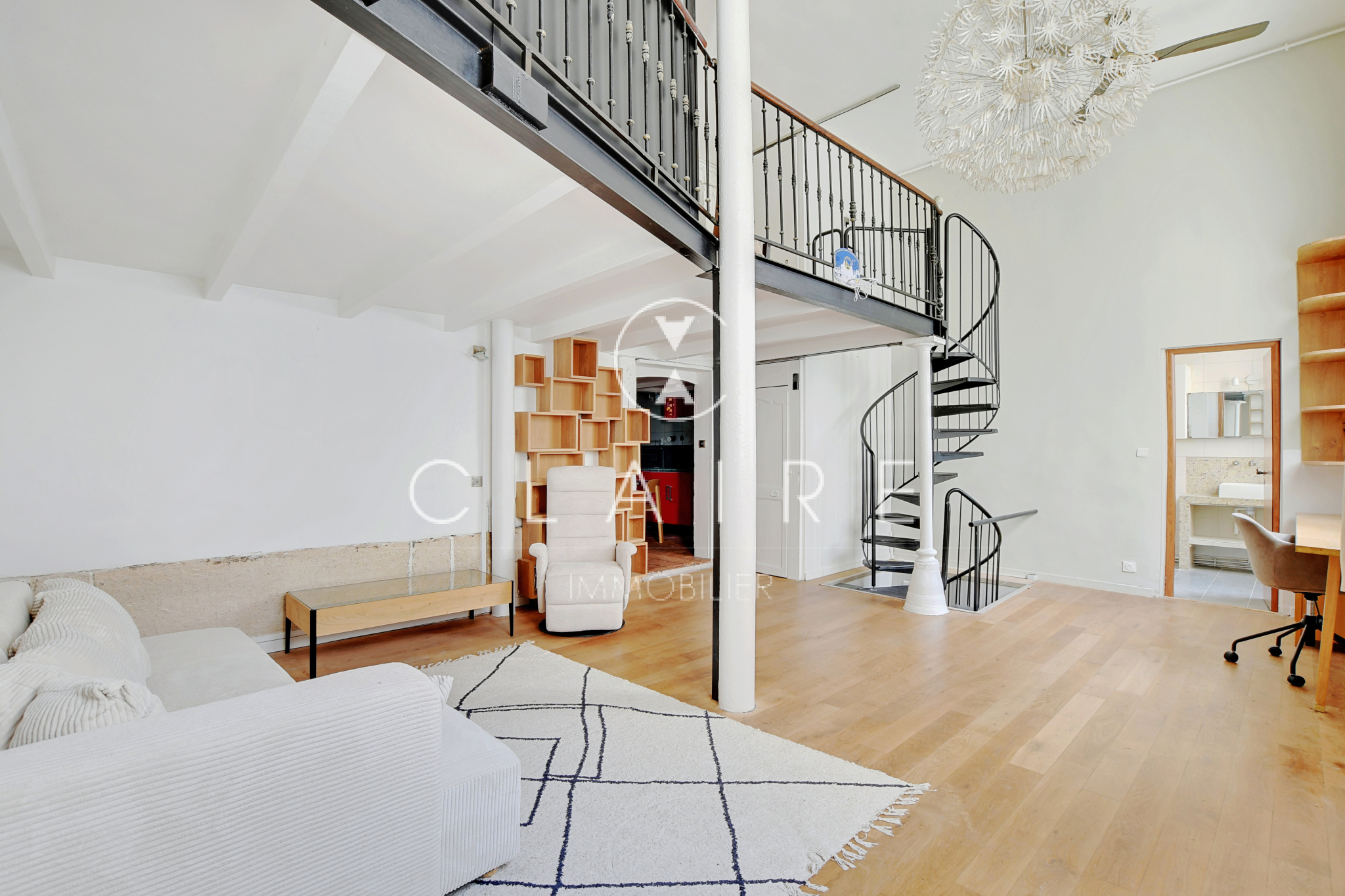 Agencé sur trois niveaux, il se compose comme suit : au RDC, une entrée desservant un séjour, une salle de bains avec baignoire, une cuisine et un WC. Au 1er étage, trois chambres dont une en mezzanine cloisonnée et une seconde excentrée avec bureau séparé. Au -1, un espace détente avec canapé et dressing séparé. Un escalier de métal en colimaçon dessert les différents espaces.