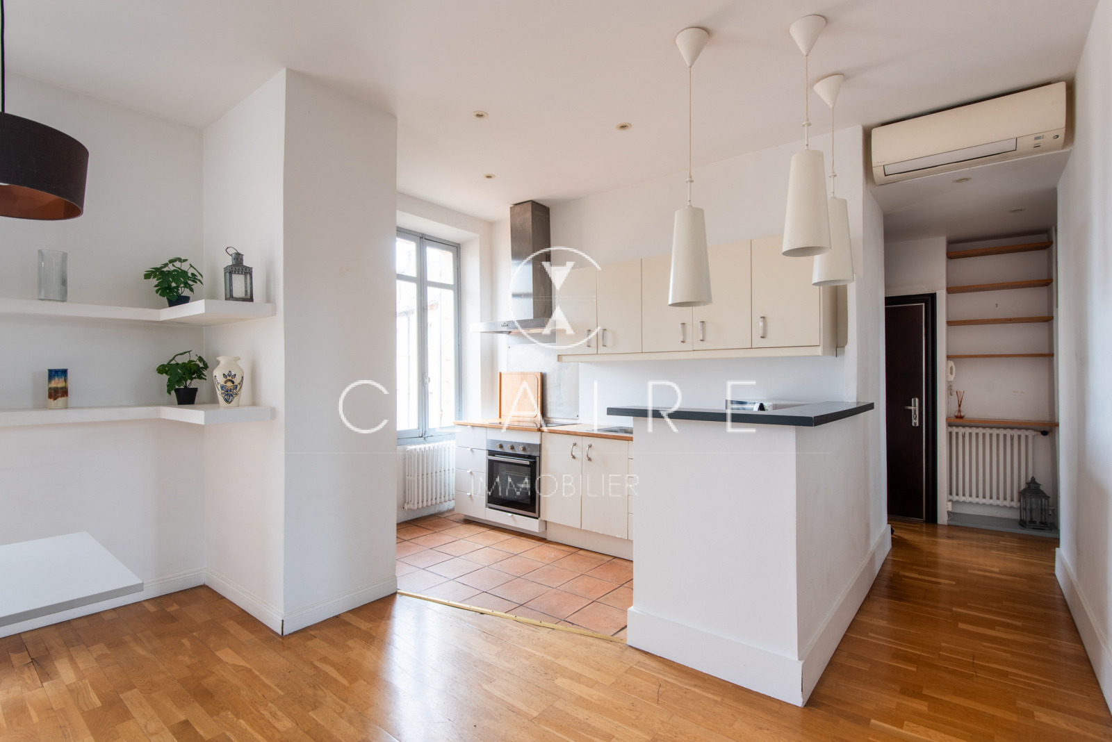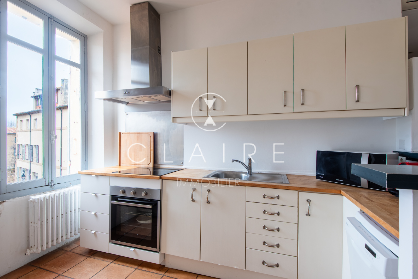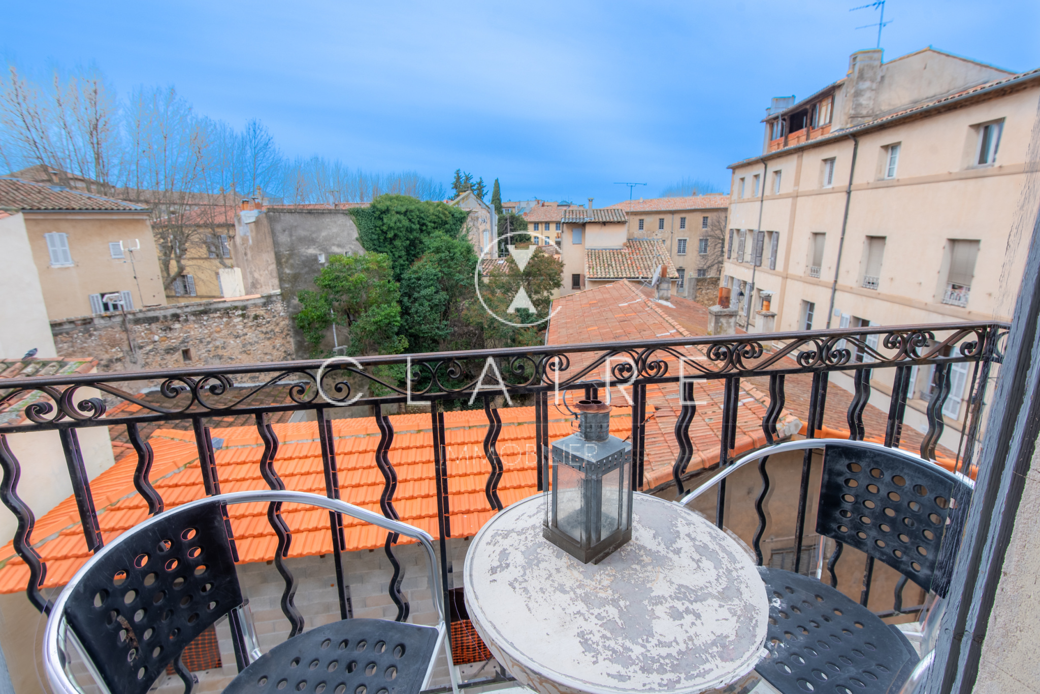 Deux petits balcons exposés Sud-Ouest offrent une agréable vue dégagée sur les toits du centre-ville et une petite rue paisible à l’arrière du Cours Saint-Louis.