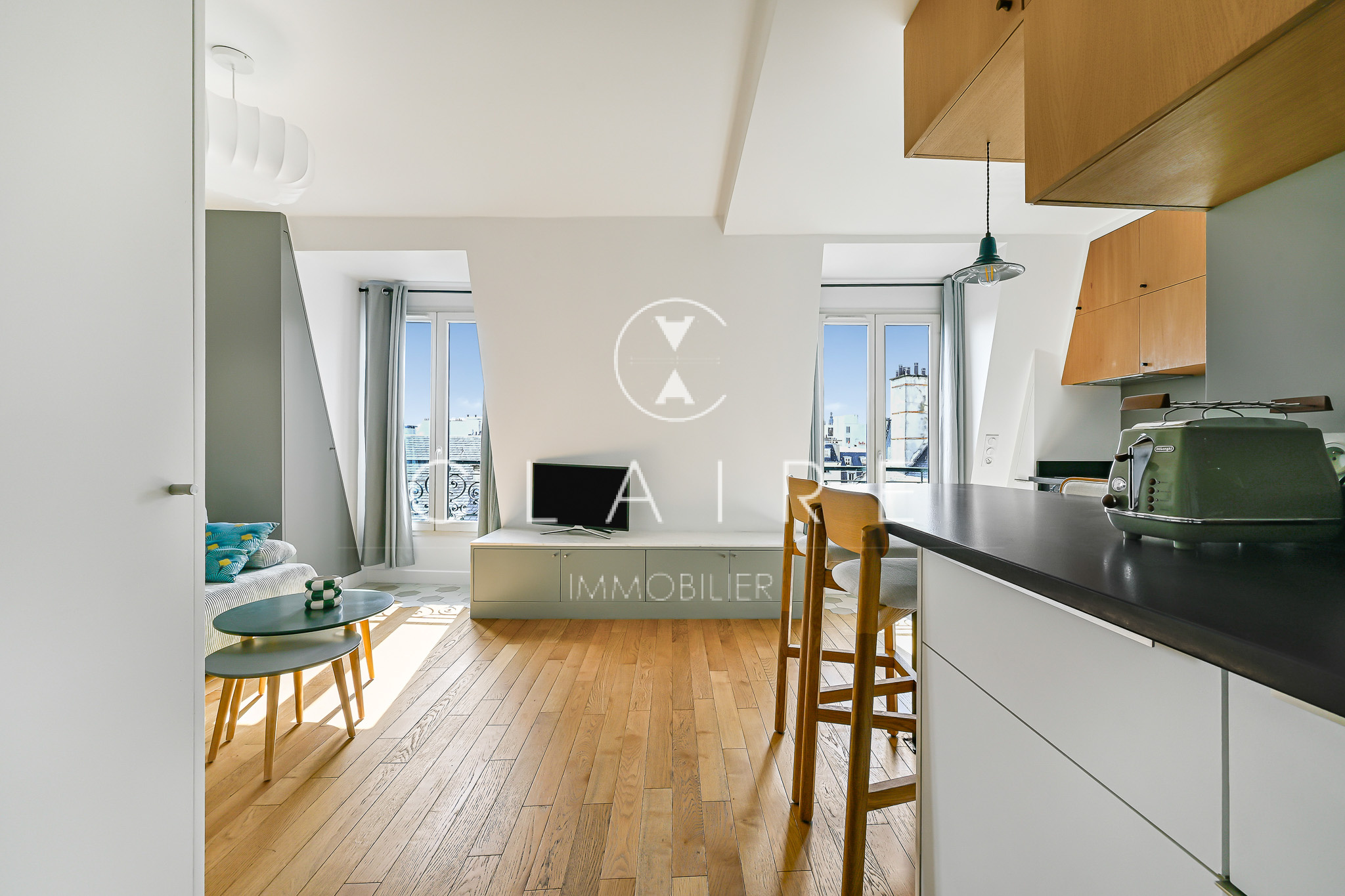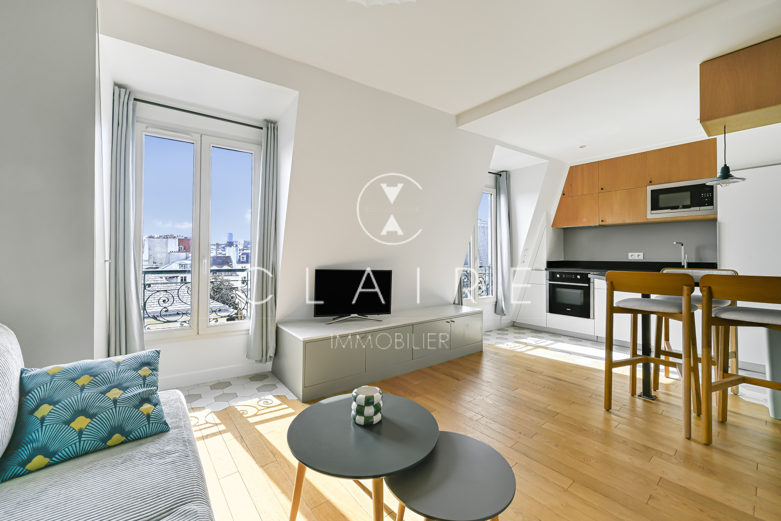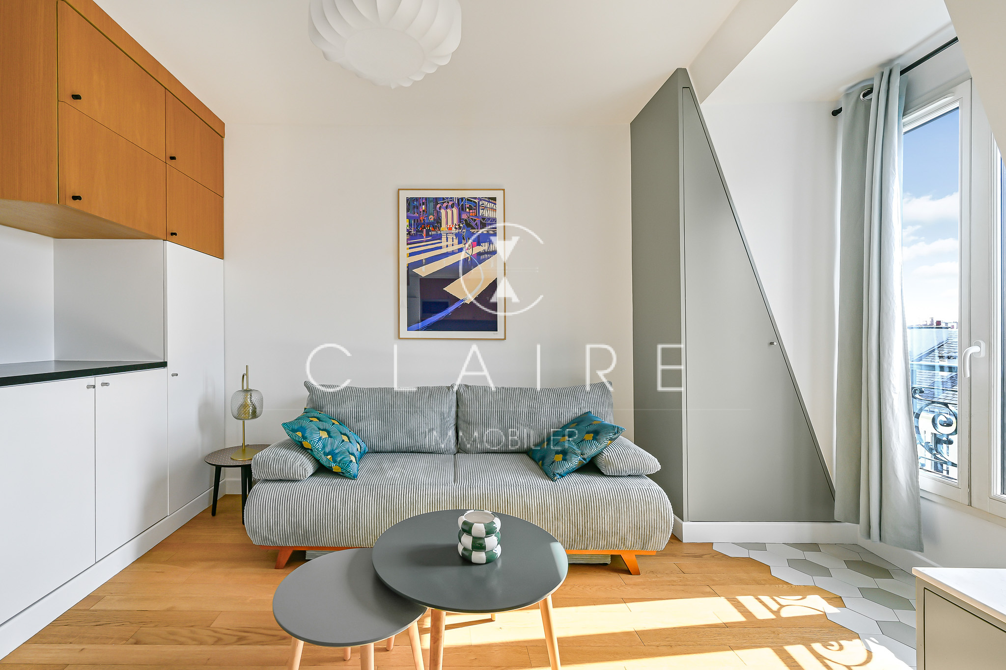 Baigné de lumière grâce à son exposition sud-ouest, cet appartement meublé avec goût offre une pièce de vie chaleureuse avec cuisine ouverte, entièrement aménagée et équipée. La chambre, intelligemment agencée avec un lit coffre, dispose de nombreux rangements intégrés. Une salle d’eau fonctionnelle avec une fenêtre sur cour.