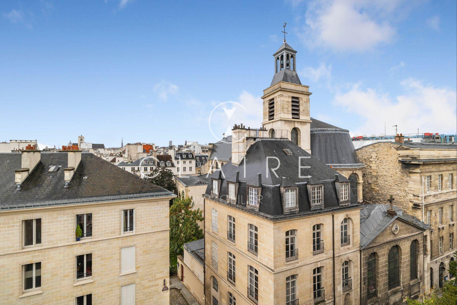 Un atout rare : une vue dégagée sur l’église des Blancs-Manteaux, apportant charme et quiétude à cette adresse de caractère. Et surtout un ascenseur en plein coeur du Marais ! Venez le voir cet été nous sommes ouverts !