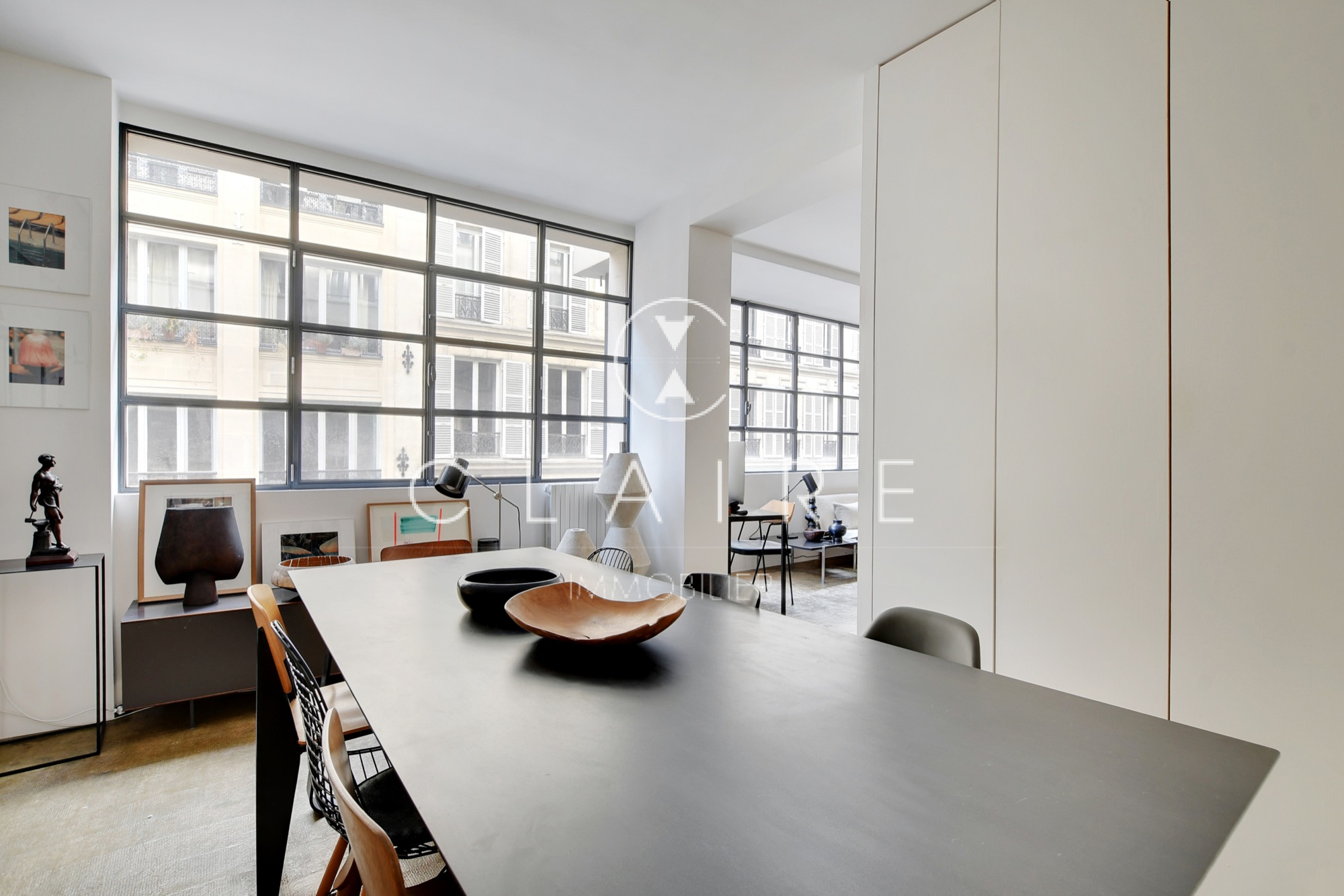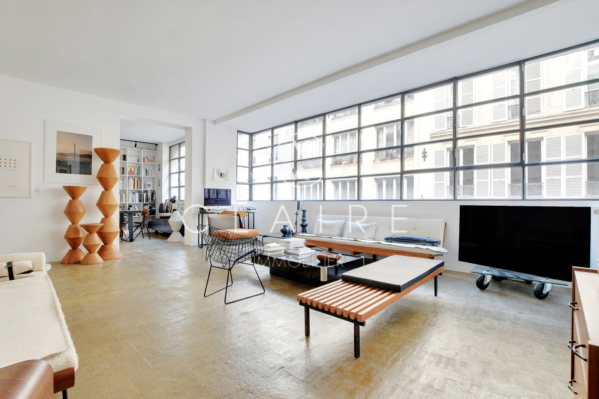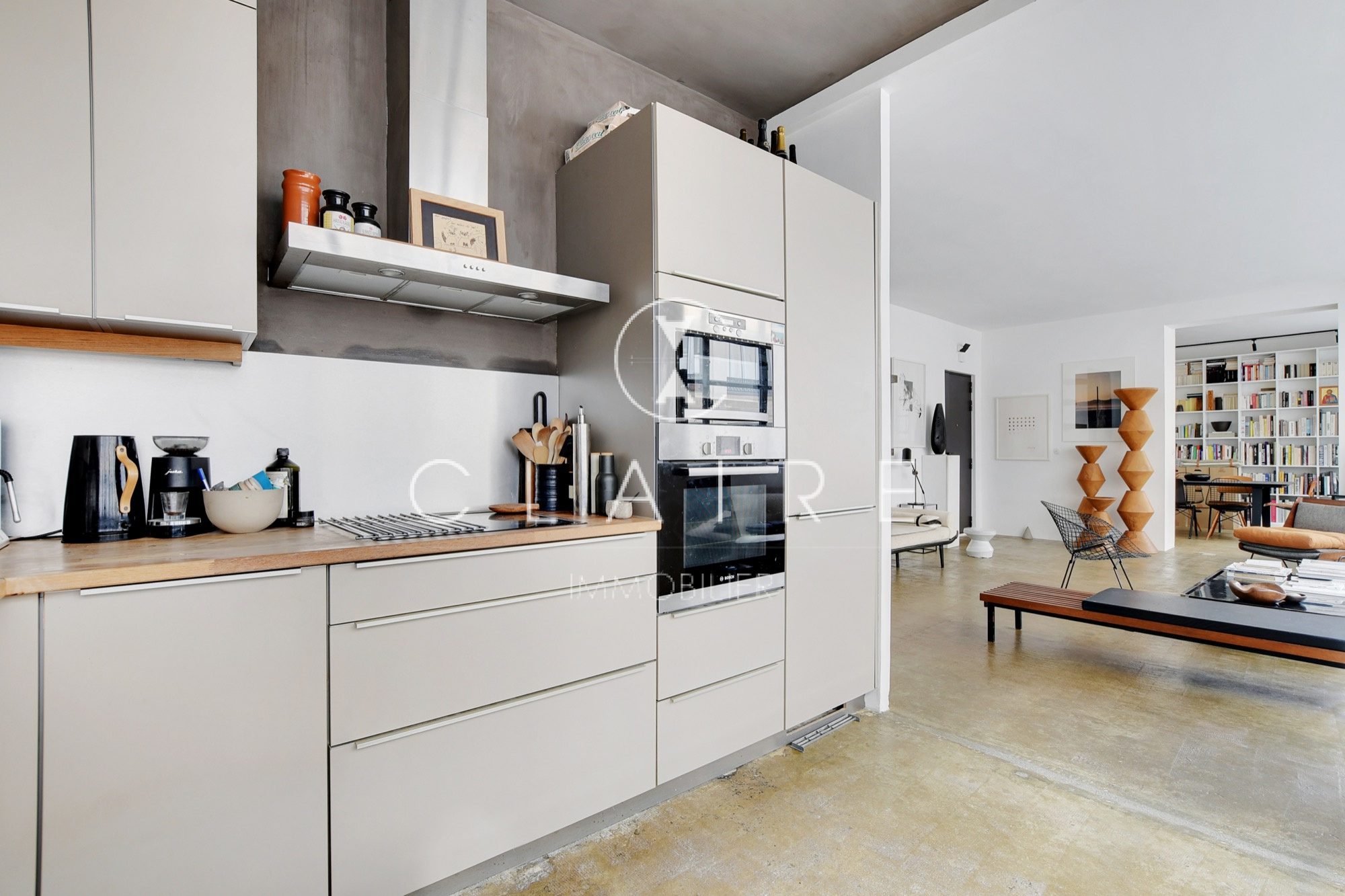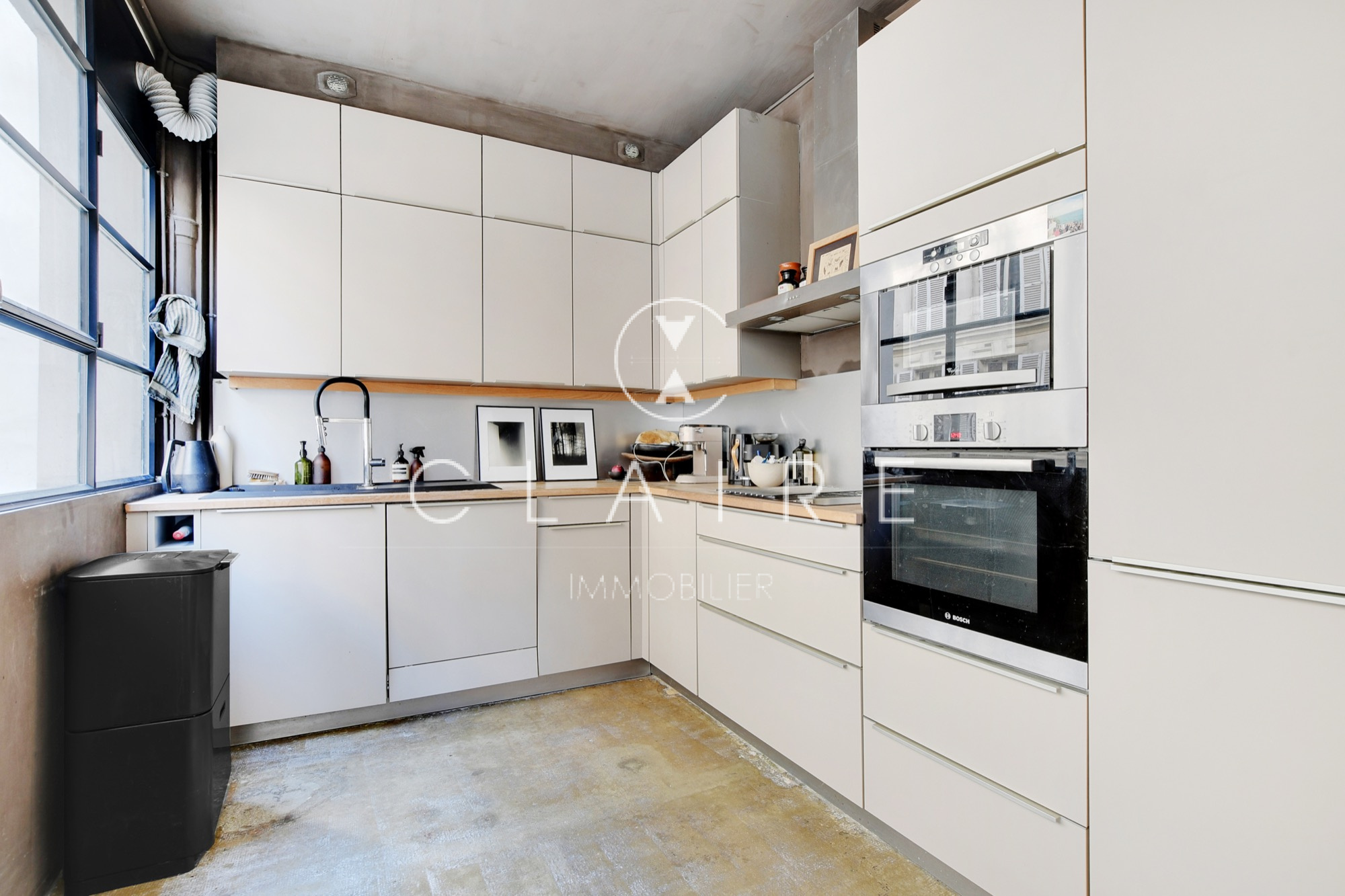 Ce bien rare, à l’esprit loft new-yorkais, séduit par sa belle hauteur sous plafond et ses grandes fenêtres atelier. L’appartement se compose d’un vaste double séjour de 30m2 avec cuisine ouverte de 8m2 (qui peut également être cloisonnée en verrière), d’une salle à manger pouvant devenir une seconde chambre ( 14m2), d’une chambre principale (14m2) avec salle de douche, ainsi que de nombreux rangements.