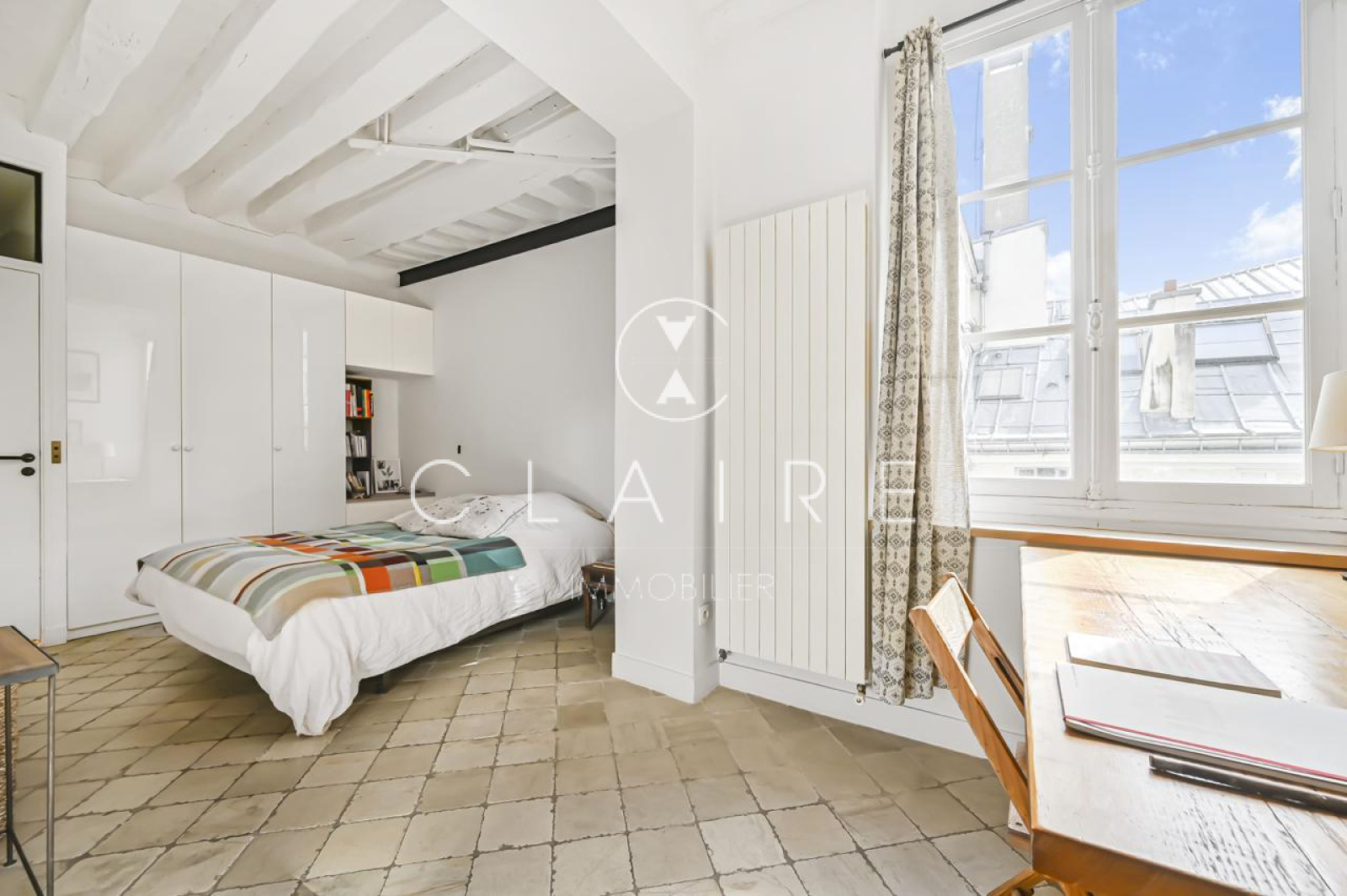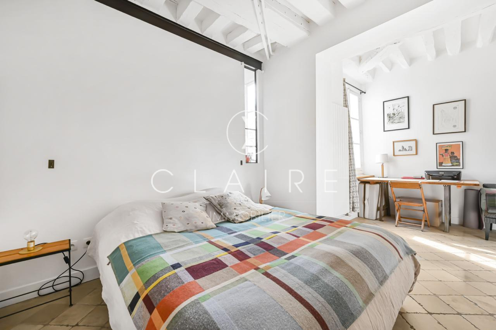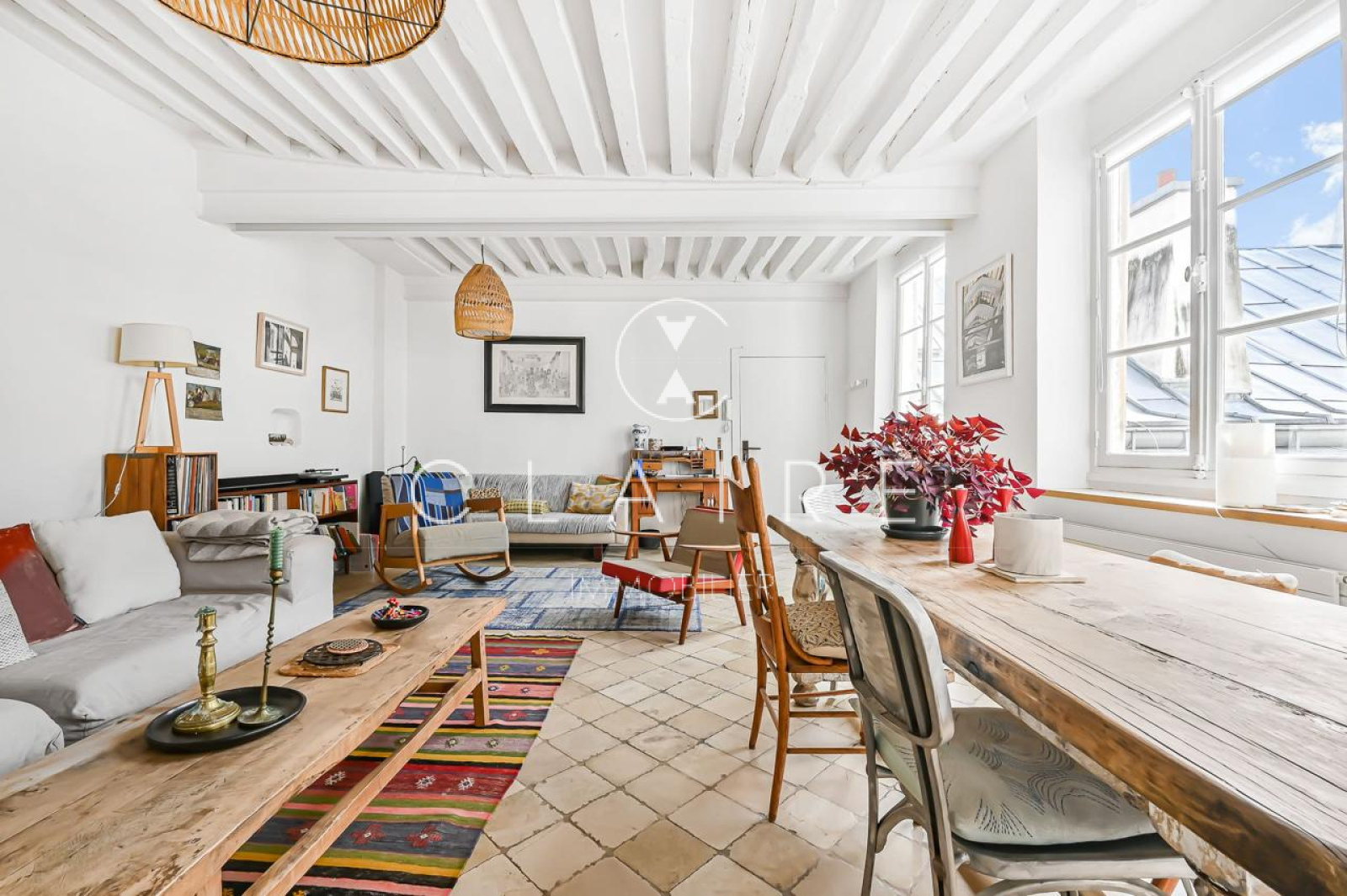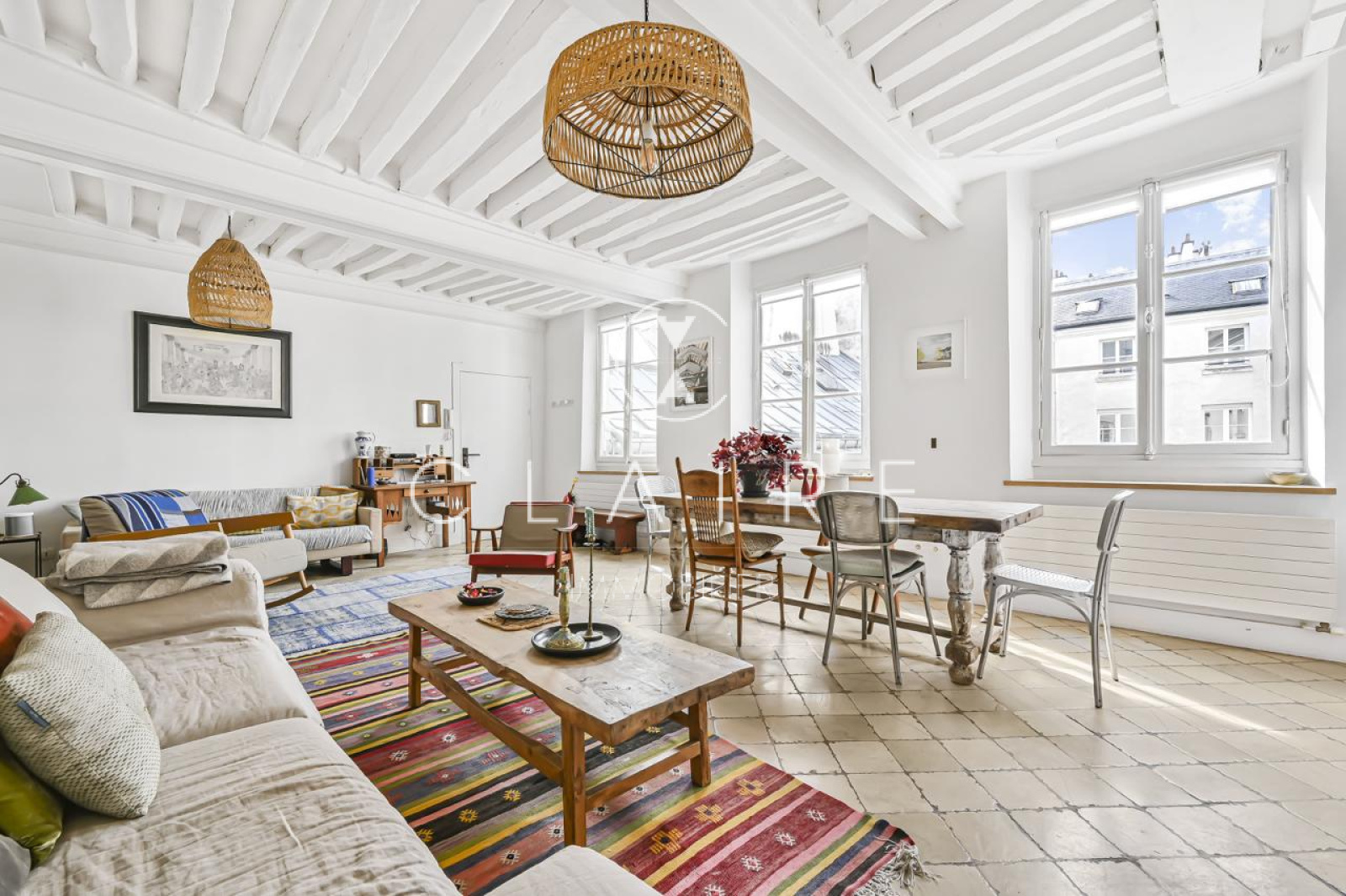 Le charme de l'appartement est accentué par des poutres apparentes et une cheminée, qui ajoutent une touche d'élégance et de caractère à l'ensemble.