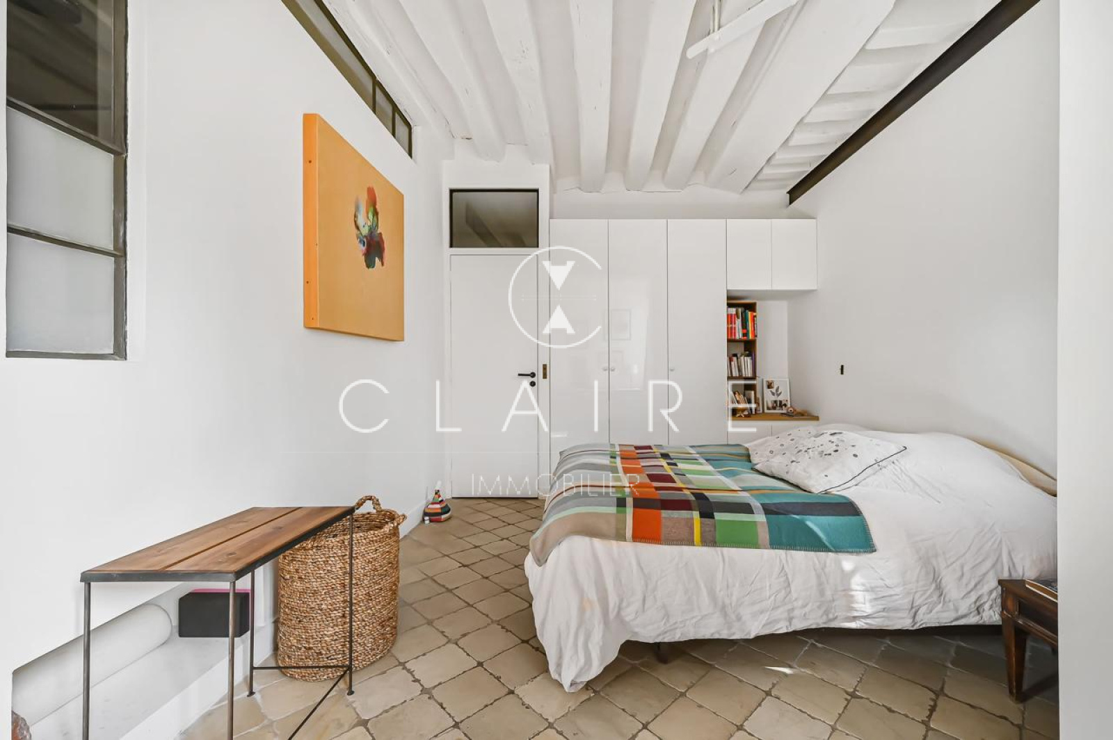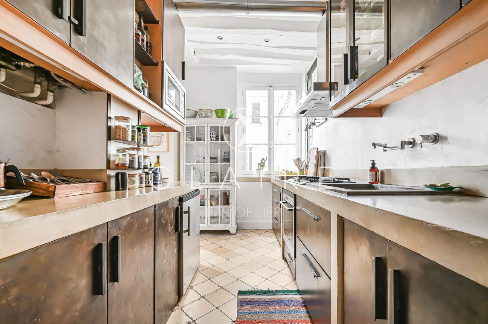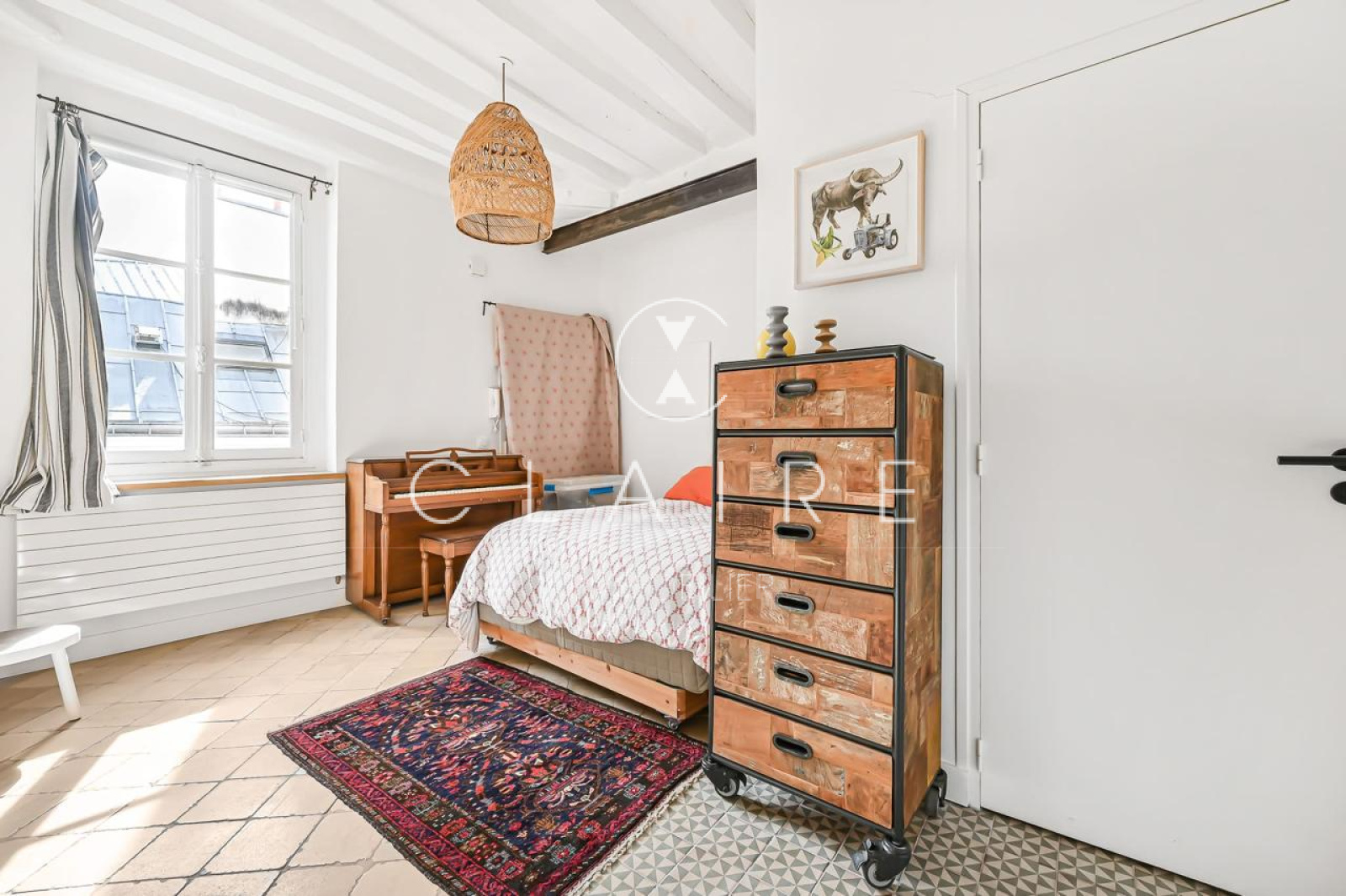 Le charme de l'appartement est accentué par des poutres apparentes et une cheminée, qui ajoutent une touche d'élégance et de caractère à l'ensemble.