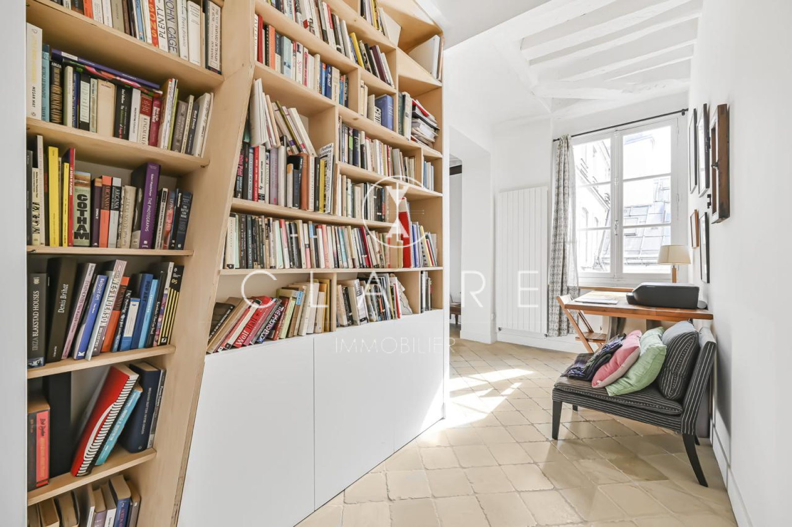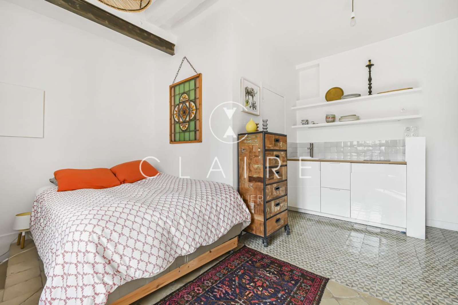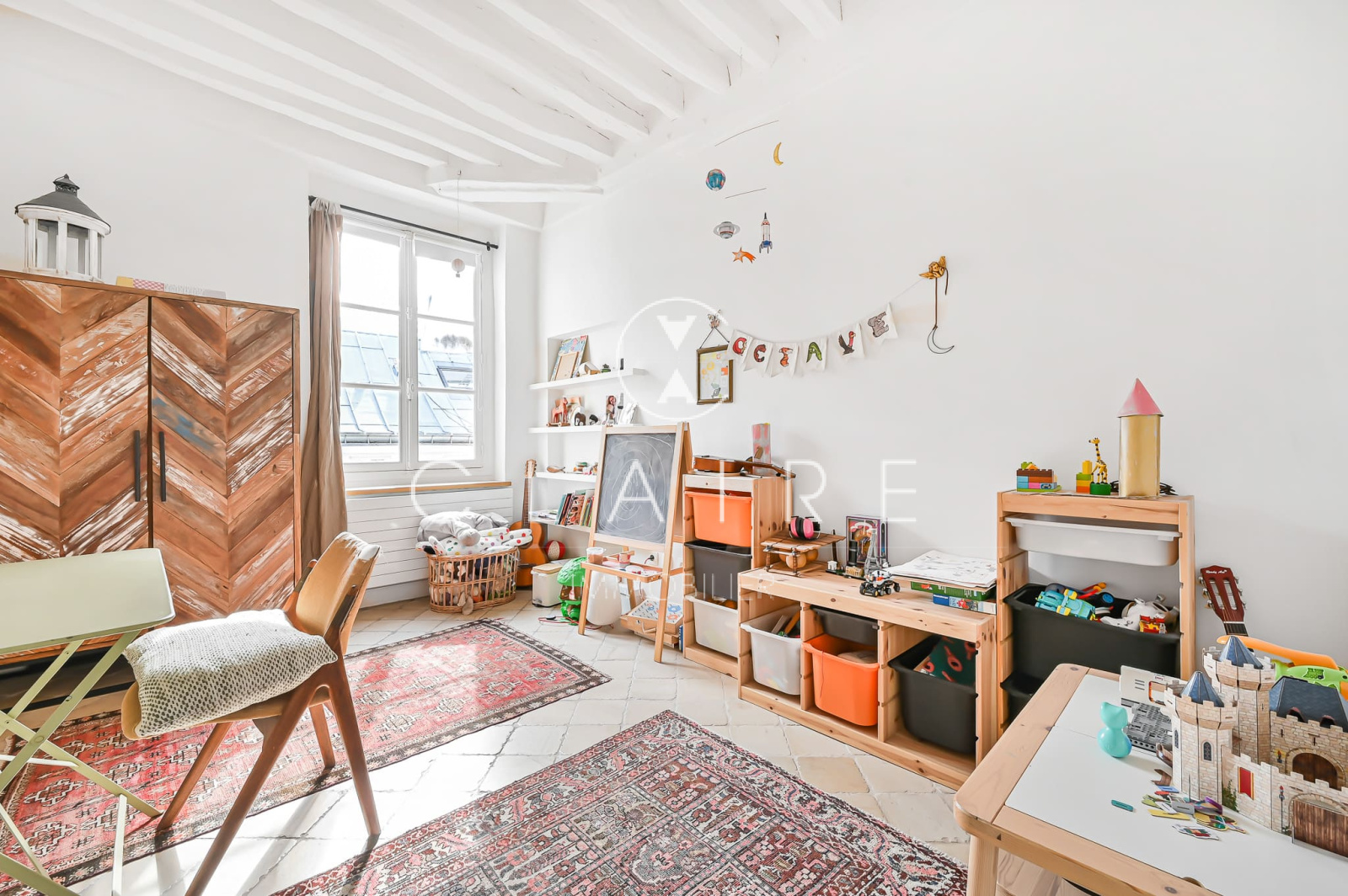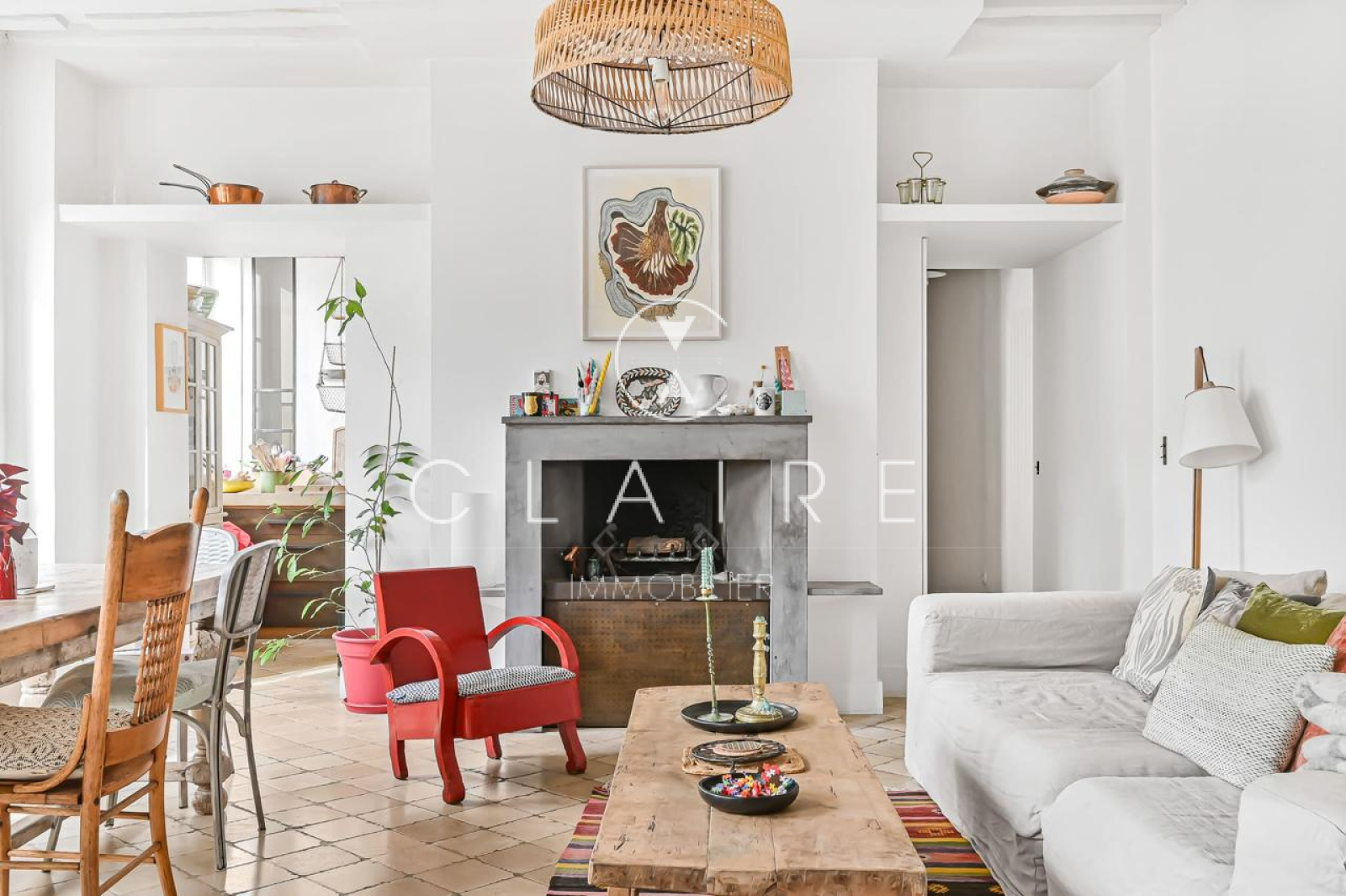 Le charme de l'appartement est accentué par des poutres apparentes et une cheminée, qui ajoutent une touche d'élégance et de caractère à l'ensemble.